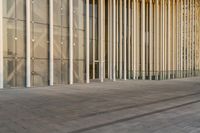 A person rides their skateboard on the urban pavement in front of a striking modern office building. The glass wall facade showcases the futuristic architecture of the bustling business district at daybreak.