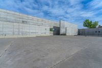 A modern urban plaza in Zaragoza, Spain. The concrete walls and open spaces showcase the city's unique architecture. The clear skies and cloud formations add to the charm of this European city.