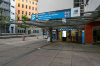 Busy urban plaza in Stuttgart, Germany. People walk in and out of shops, restaurants, and cafes. The vibrant city atmosphere is complemented by the modern urban design. Ample parking is available in the nearby parking garage.