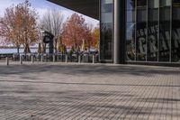 This is an image of a modern office building in Toronto, Ontario, Canada. The architecture reflects the urban landscape of the city, with its sleek lines and reflective surfaces. The building is surrounded by trees with autumn leaves, providing a splash of color against the winter backdrop. The image also showcases a plaza with open space and a curved road surface. In the distance, a pier and jetty can be seen, further emphasizing the city's connection to the harbor. This photo captures the bustling business district of Toronto, representing both the city's modernity and natural beauty.