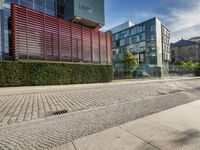 This image showcases the modern architecture of Berlin, Germany. It captures a snapshot of a residential area in the city, with a clear sky above. The buildings in the photo exhibit unique facades and lines, representing the urban landscape of Berlin. The road surface and cobblestone add to the charm of the public spaces. The image also highlights an office building, symbolizing the business district of the city. Berlin's architecture and bustling business scene make it a vibrant and dynamic city in Europe.