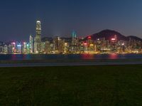 a cityscape at night as the lights of skyscrapers shine on the hills