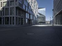 This is an image taken in Berlin, Germany, showcasing the modern architecture and urban design of the city. The photo captures a straight road lined with buildings and glass facades. The metropolitan area of Berlin is reflected in the glass walls of the office buildings. The cityscape exudes a vibrant and lively atmosphere, representing the bustling city life and business district of Berlin. The hard shadows created by the buildings add depth to the composition. This photo highlights the unique material properties and infrastructure of a major European metropolis.