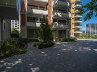 Urban residential area in Berlin, showcasing modern architecture and city life. Hard shadows on pavers create a striking urban design. Clouds in the sky contrast the open spaces. A typical day in the capital of Germany.