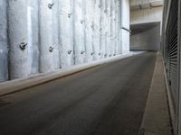 This image showcases the modern architecture and infrastructure of Berlin, Germany. A narrow street is lined with concrete walls featuring unique patterns and security bars for added safety. The road surface is made of smooth asphalt, providing a clean and sleek appearance. The entry and exit ramps to the highway can be seen in the distance, symbolizing the urban connectivity of the city. The natural light illuminates the structure, highlighting its design. This photo captures the essence of Berlin's architectural charm and showcases the city's modernity.