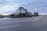 This stock photo features an urban road at dawn in Markham, Ontario, Canada. The architecture of the residential buildings in the town can be seen in the background. The road surface, made of asphalt, curves in an S-shape, creating an interesting visual effect. The sky is grey with clouds, adding a dramatic touch to the scene. A tree stands by the side of the road, providing a touch of nature in this urban setting. The photo captures the infrastructure and public space of this town in Ontario, Canada.