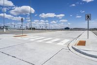 This image showcases a street in Toronto, Canada with a crosswalk and buildings in the distance. The road is made of concrete and lined with suburban infrastructure such as street lights and parking lots. The clear sky above is dotted with a few clouds and contrails. The open space and clear signage indicate a safe and well-maintained urban area. This photo captures a typical day in Toronto, highlighting the city's architecture, infrastructure, and urban landscape.