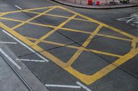 This stock photo features an intersection in Hong Kong, China. The road is painted in vibrant yellow, providing a striking contrast against the surrounding urban infrastructure. An old bus stop sign is situated in the middle of the road, indicating the presence of public transportation. The open space and well-defined lane and curb design ensure smooth traffic flow and pedestrian safety. The elevated road and high-rise buildings in the background depict the bustling urban landscape of Hong Kong. Captured during the day, this image showcases the vibrant energy and modern cityscape of this Asian metropolis.