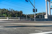 This stock photo features a traffic light at the intersection of an urban road and a road that crosses over the freeway. The asphalt road is located in Los Angeles, California, USA. It is surrounded by residential areas with trees lining the streets. The image showcases the infrastructure of the road surface, bridge, fence, and overhead power lines. It captures the suburban atmosphere and the public space with street lights illuminating the thoroughfare. The clear sky adds to the overall scene, creating a vibrant cityscape.