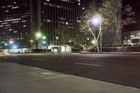 A bustling city street in Los Angeles, California at night. Modern architecture and city lights illuminate the urban landscape. Tall office buildings tower over the empty road, creating a captivating cityscape.