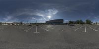 the view of an empty parking lot from a fisheye lens with white markings on it