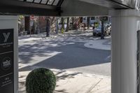 This stock photo captures a city scene in Toronto, Ontario. A man is walking down the street, passing by some bushes and a traffic light. The modern architecture and concrete road surface create a contemporary and urban ambiance. The lush vegetation and grass add a touch of greenery to the cityscape. This image showcases the intersection of nature and urban design, highlighting the liveliness of city life in Toronto.