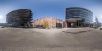 A modern architectural marvel in Hamburg, Germany. This circular mirror in a parking lot reflects the open space and surrounding buildings. The profile and shadow add depth to the urban setting.