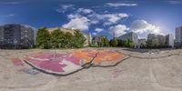 Panoramic view of an urban skate park in Berlin, Germany. Colorful graffiti covers the concrete surface, showcasing the city's vibrant urban art scene. Clear sky overhead adds to the energetic atmosphere of the sport. An empty lot nearby provides open space for additional activities.