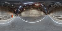 A skate park located in an urban tunnel, with concrete walls and ramps. The fish-eye view captures the dynamic design and rolling motion. The artificial light creates a dramatic and energetic atmosphere.