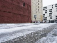 This is an image taken in Detroit, USA. It shows a snow-covered road surrounded by buildings and an urban neighborhood. The winter scene captures the freezing temperatures and the snow accumulation on the road surface and the walls. The brick wall provides an interesting visual element in the image. The photo depicts a typical day in Detroit during the winter season. The open spaces and parking lots highlight the urban landscape of the city. This photo represents the urban charm of Detroit's art district.
