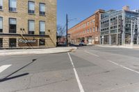 A modern urban street in Toronto, Canada. Clear sky accentuates the clean lines of the architecture. The empty road surface is lined with brick houses and buildings. A quiet day in the city.