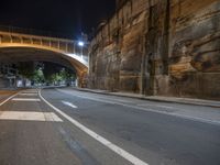 A dark urban street at night, illuminated by street lights. The tar road surface reflects the city lights and the clear sky above. The underpass and bridge create an interesting urban design.