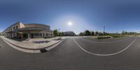 an 360 - degree view of street in front of a building near some bushes and a bench