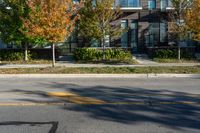 a fire hydrant on a tree lined street next to tall buildings and trees with autumn leaves in the window