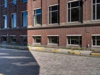 This stock photo features a view of an urban street from a low perspective. In the scene, a man is walking along the road surface. The vibrant city life is showcased by the numerous buildings and classic architecture. The brick walls and pavement add to the charm of this European city in the Netherlands, specifically in Holland. The presence of vegetation and hard shadows enhance the urban design of the alley-way. The image captures the essence of an urban environment with a touch of historic charm.