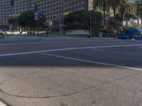 A clear sky over Los Angeles, California illuminates the modern architecture of the business district. Trees and vegetation line the streets, while vehicles and buses traverse the asphalt roads. Office buildings and hotels add to the urban design.