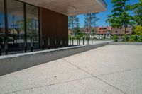 This image captures the urban design of Colmar, France. The clear sky frames the city's old town, with its charming old buildings and cobblestone streets. The skateboard leaning against a wall near a park showcases the city's active and youthful atmosphere. In the background, trees and an office building provide a contrast between nature and urban life. This photo represents a typical day in Colmar, where the city's surface, asphalt roads, and urban elements blend seamlessly with the surrounding environment.