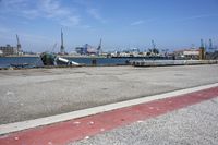 This is an image of a coastal city in California, USA, specifically Los Angeles. The photo captures a clear sky above the cityscape, with asphalt roads and concrete surfaces visible. In the foreground, there is a road leading to the coast, where water and the Long Beach pier can be seen. There are also boats and ships in the harbor and a river flowing into the ocean. The image showcases the urban and transport infrastructure of Los Angeles, with a jetty and landing area visible in the background. This photo represents a typical day in the city.