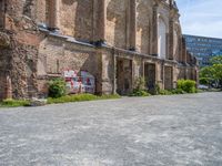A gritty scene in Berlin's art district. Vibrant graffiti covers a classic brick wall in an open urban space. The rugged architecture of a warehouse contrasts with the lush vegetation of a nearby plaza.
