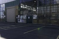 A lone white motorcyclist parked near the side of the street in an industrial area of Toronto. The modern architecture of nearby office buildings creates striking shadows in the clear sky. A glimpse into the urban design of Canada's largest city.