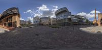 Urban scene in Berlin, Germany, showcasing modern architecture with a mix of warehouse and office buildings. Cobblestone courtyard under a cloudy European sky. A city life snapshot in a bustling business district.