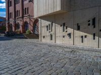 Urban Berlin cityscape with modern architecture and historic cobblestone streets. The warehouse courtyard casts hard shadows under cloudy skies. A blend of old and new architecture in Europe's dynamic capital city.