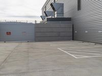 This image captures the urban landscape of Los Angeles, California, USA during the day. The modern architecture of the city is showcased in the concrete streets, buildings, and parking lots. A grey sky serves as the backdrop for this industrial scene, with factories and warehouses visible in the distance. The open spaces and driveways provide entry points to various storage facilities and hangars. The photo highlights the blend of modern architecture and industrial infrastructure that characterizes the city of Los Angeles.