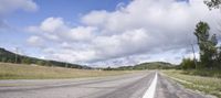 A scenic view of a lush green landscape in the USA. The asphalt road leads through the picturesque nature, surrounded by clouds. A beautiful day to traverse the highway.