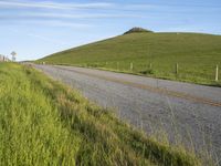 This image showcases the beautiful landscape of rural California, USA. The road made of asphalt winds through the lush green fields and hills. The clear sky is filled with fluffy clouds and contrails, adding depth to the natural environment. In the foreground, the grass surfaces are well-maintained, reflecting the importance of agriculture in this prairie area. The elevated view captures the vastness and serenity of the surroundings. This is a perfect representation of a sunny day in the rural regions of California.