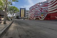 This image captures the architectural beauty of Los Angeles, California, USA. The modern cityscape showcases a mix of futuristic office buildings and museums in the business district. The sidewalk is empty, giving a sense of urban solitude. A prominent feature is the building with a red and white striped design on the facade. The day is bright, with clear skies above. The photo represents the vibrancy and innovation of this bustling city.