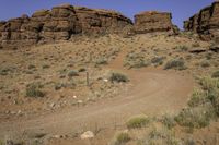 Elevated dirt road in the canyonlands of Utah. Red rock formations and sand streets create a unique landscape. Clear sky highlights the person's shadow on the path. A perfect day to explore nature in the USA.