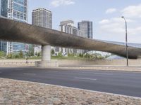 View of an urban cityscape in Chicago, Illinois. The iconic architecture is complemented by the city's impressive skyline. The concrete bridge and underpass showcase the city's urban design. A walkway lined with trees and guard rails adds to the charm of the city.