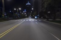 A night view of Chicago, Illinois with its iconic modern architecture. The city lights create streaks of light across the urban landscape. Straight down the road, the motion blur captures the fast-paced city life.