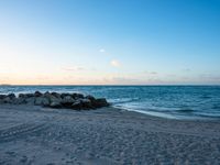 A beautiful coastal landscape in Miami Beach, Florida. The urban design blends seamlessly with nature, as the sandy beach meets the ocean's sparkling surface. The city skyline and clouds add to the vibrant atmosphere of this urban paradise.