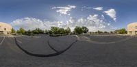 the circular image was taken of a circular driveway with buildings and trees in front of it