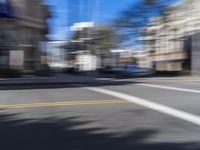 This is an image of a city street in the USA. The asphalt road stretches out in front of the viewer, lined with buildings and parking lots. The facade of the buildings creates an interesting pattern against the clear blue sky with clouds. The road surface shows a motion blur effect, suggesting fast-moving vehicles. The lane markings and curbs add to the urban design of the thoroughfare. This dynamic image captures the fast-paced drive of city life.