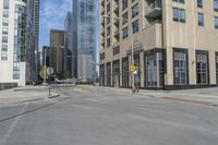 a view of the street with some tall buildings and the sky behind it on this sunny day
