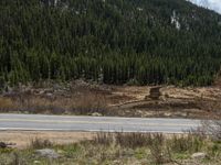 a mountain side with a road running next to the mountains, a bike parked in front of it and trees on one side