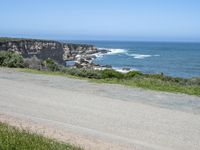 This stock photo features a scenic coastal road in California, USA. The road is made of smooth asphalt and winds along the beautiful coastline. The clear blue waters of the ocean can be seen on one side, while the grass-covered terrain stretches out on the other. The road is elevated, offering stunning views of the sea and the coastal landscape. The shore is lined with cliffs and headlands, creating a dramatic backdrop. It's a sunny day, with a clear sky above. The road surface is well-maintained, making it perfect for a leisurely drive or a peaceful walk by the beach.