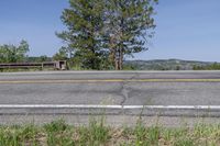 An empty highway in Colorado, surrounded by lush green grass and mountains in the distance. A bench stands alone, offering a serene view of the natural landscape. Clear skies and no traffic make this an ideal spot for relaxation.