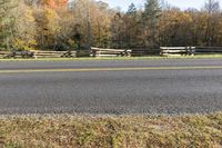 A scenic country highway in the USA, surrounded by autumn foliage. The road is lined with trees and a fence, with a picturesque field in the background. A perfect day for a drive in the rural landscape.