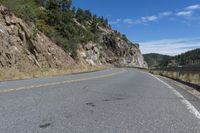 the road is winding down between two cliffs of a mountain range with trees in the background