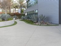 This is an image of a modern architecture office building in the business district of Los Angeles, California, USA. The building features a glass wall facade and a courtyard in its center. The urban landscape is characterized by concrete streets and walls. The image represents a sunny day in the city, with clear skies and bustling activity. The glass surfaces reflect the surrounding buildings and provide a sleek and professional look. This photo captures the essence of the business environment in Los Angeles.