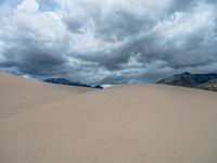 The Great Sand Dunes National Park in Colorado offers a unique desert landscape. The gloomy grey sky contrasts with the vast open space and towering sand dunes. A picturesque scene that showcases the natural beauty of Colorado.